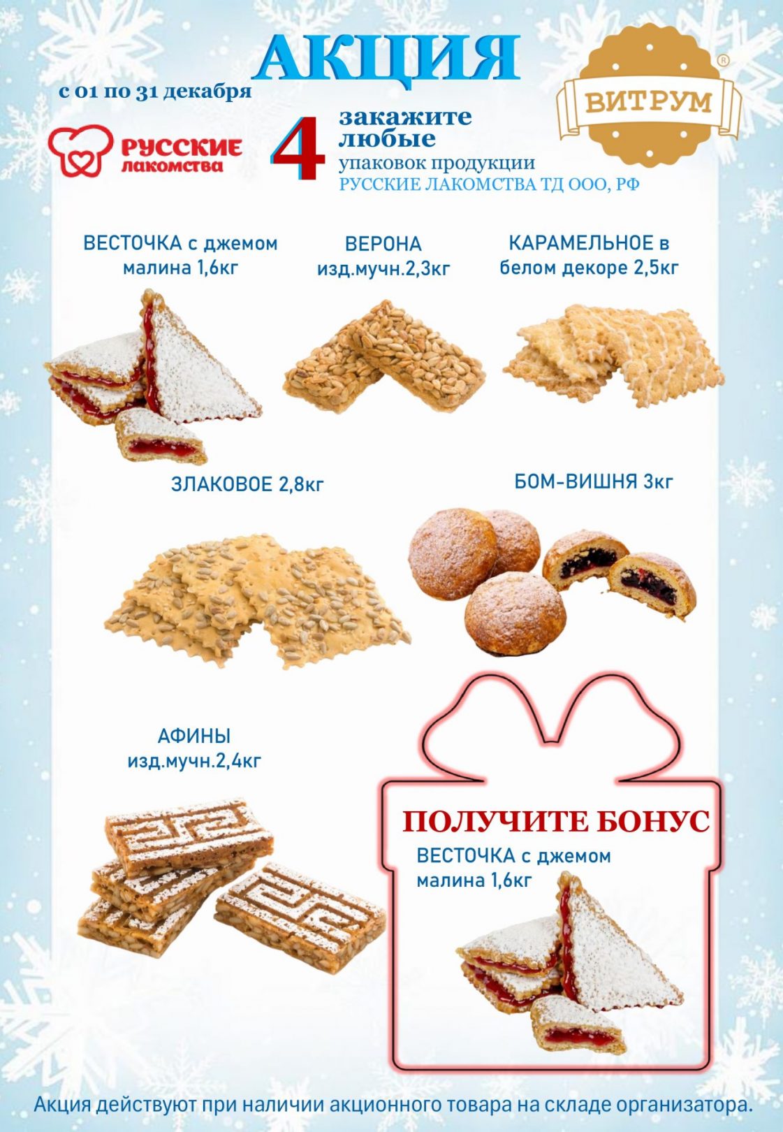 - Дополнительные скидки и бонусы на товар, участвующий в Акции «Русские лакомства 4+1» не распространяются.